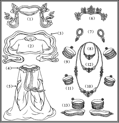 (1)冕旒(ཅྫོད་པན།) (2)肩披(སྟྫོད་གཡྫོགས།) (3)飘带(དར་དཔྱངས།)