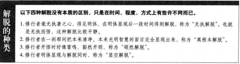 这样,在无修无整无散乱中,修行者所有妄念,所有能思、所思,所有分别、执著,都在某一个时候尽数消散,就在这个当下,赤裸裸的本觉心体就显现出来了,修行者也就此获得解脱。