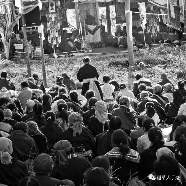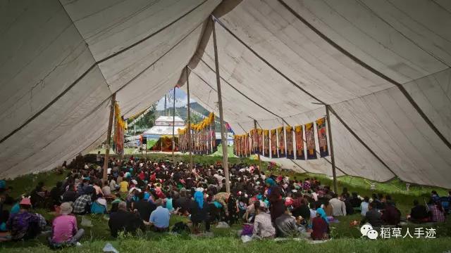 雨停了一会,却忽然大起来,仿佛也赶来法会最后一天抓住机会获得加持一般地急切。人都聚拢在大帐里,有少数的一些打着伞站在雨里听法。