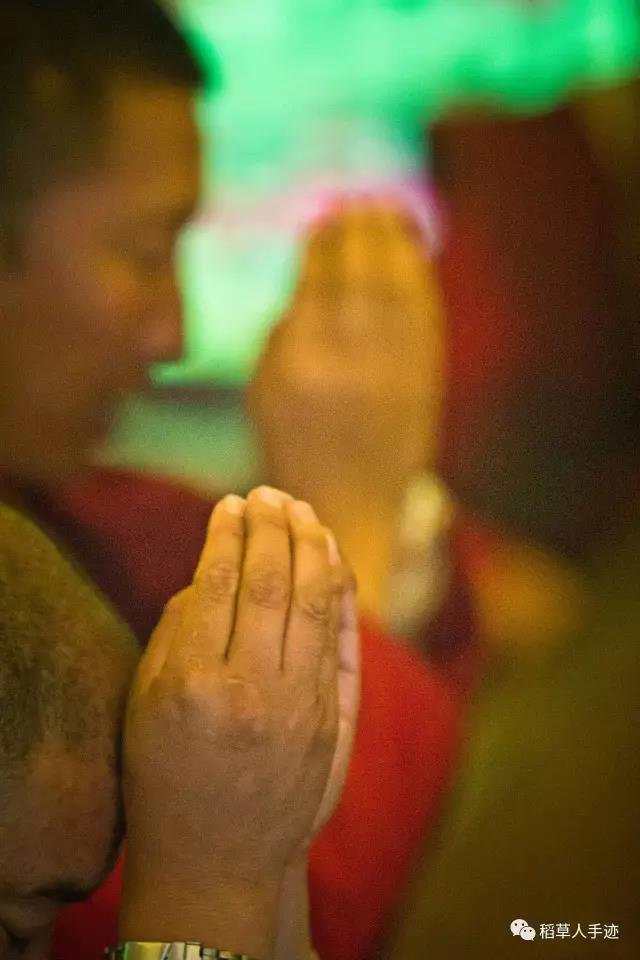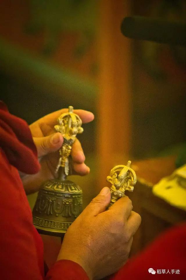 当我的镜头转向帐内,只见法座之上,上师仁波切穿戴威仪,此刻端坐在大帐正中间,右手里握着五股金刚杵,左手拿着铃铛,变换着法式打着手印。那寓意我其实并不懂得,但是那种随着诵经的节奏偏偏舞动的手印在我眼里比舞蹈动作还要优美,而且伴着几分优雅……