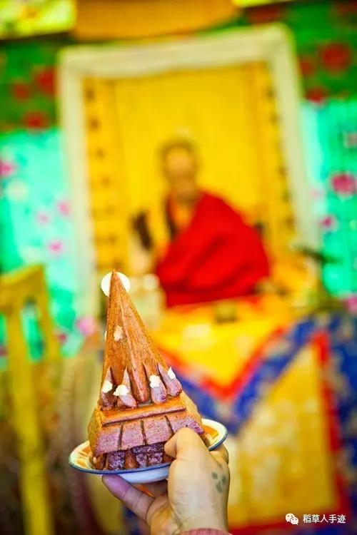 供护法的程序依然进行,希冉喇嘛恭敬地双举着供品,是涂抹上红色和白色的“朵玛”。朵玛分不同种,用来上供下施,所以上面涂的颜色也分红白黑等不同的颜色。在法会上师父做的朵玛上面涂上红色或白色代表着上供不同的神佛或经典。