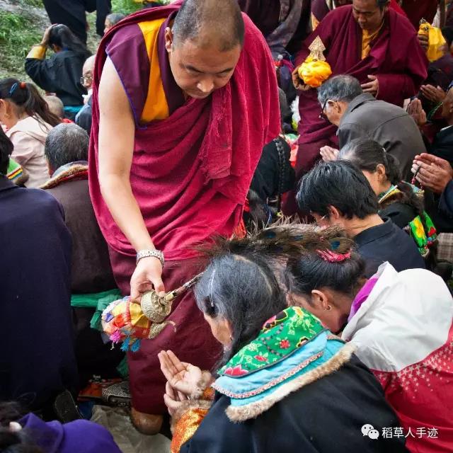 法会上旦增师父和其他喇嘛师父们拿着盛着甘露圣水和六味药的宝瓶,走到信众们中间灌顶,信众们虔诚的表情动作,是我从来没有见到过的,令人很感动。他们老早就伸出手热切地等候着这些喇嘛走到他们身边分享这些圣物并得到佛菩萨加持。