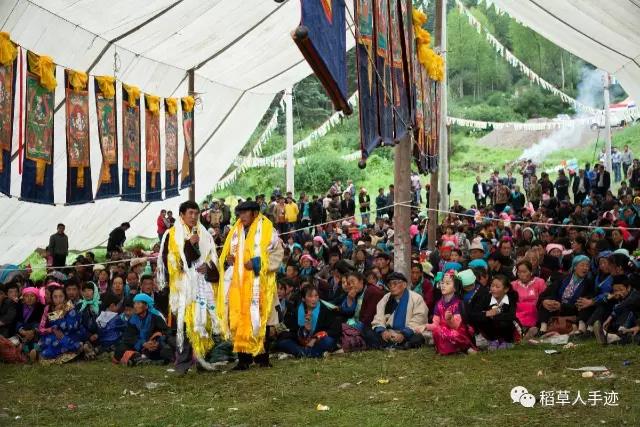 参加法会的男女老少照常自然分散开,围坐在大帐四周,空出一大片场地留作舞台。唱藏歌,跳锅庄,献哈达,迟迟不愿离去。